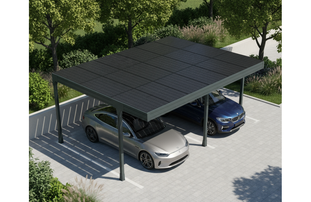 Diseñado para el estacionamiento de dos vehículos bajo un mismo módulo, el Carport solar fotovoltaico Santillana con postes desplazados ofrece mayor comodidad y seguridad en las maniobras.