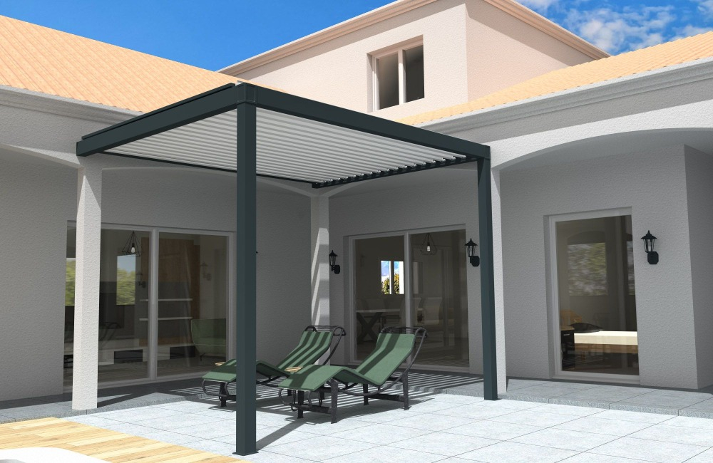 Pérgola bioclimática Herbosa pared a portería de 3,00 x 3,791, lacado gris antracita texturado, motorizada con mando y kit de luces led 3 lados por cada módulo.