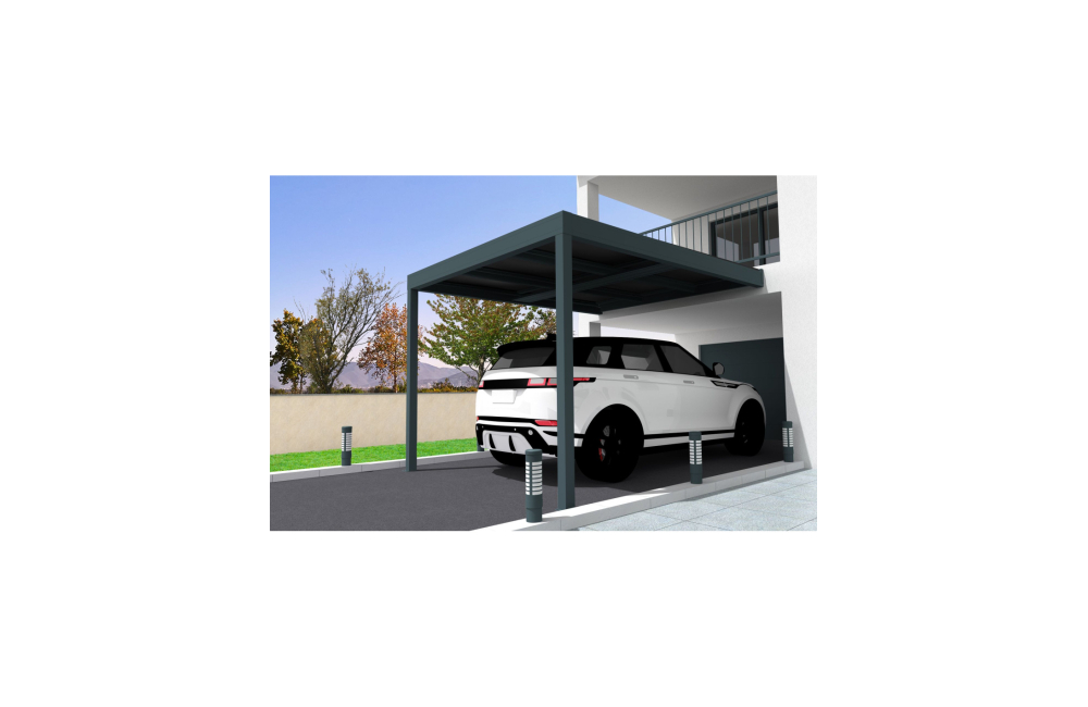 Pérgola solar Espalmador pared a portería de 1,203 x 1,820 x 2,000 de alto, lacado gris antracita texturado.